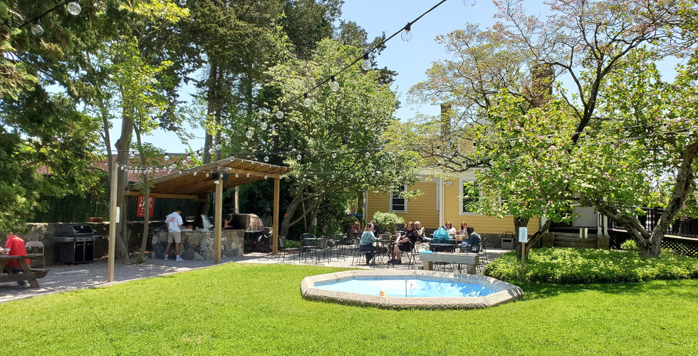 Our next stop was Grey Sail Brewing, right across the river in Rhode Island. It’s taproom is in a very unique Colonial style house. They have plenty of indoor and outdoor seating and tables, equipped with board games and corn hole. Plenty of space if you bring your children or dogs to run around outside. They offer a few snacks inside by the taproom; but outside they offer brick oven pizza!